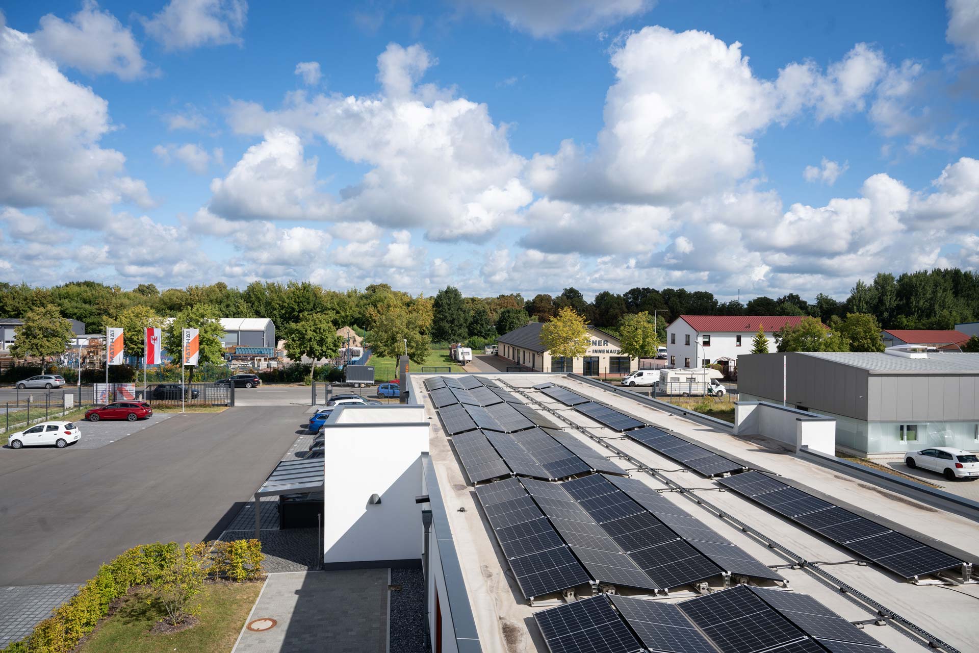Ein weiteres Leuchtturmprojekt ist am Head Office unserer Unternehmensgruppe in Verden zu verorten. Mit einem umfassenden Standortenergiekonzept, leistungsfähiger Ladeinfrastruktur, mehreren PV-Anlagen und einem ausbaufähigen Netzanschluss steht Verden für das gesamte Leistungsspektrum von Matthäi Energie und dient als Pilot für zukünftige Standorte.